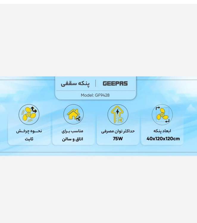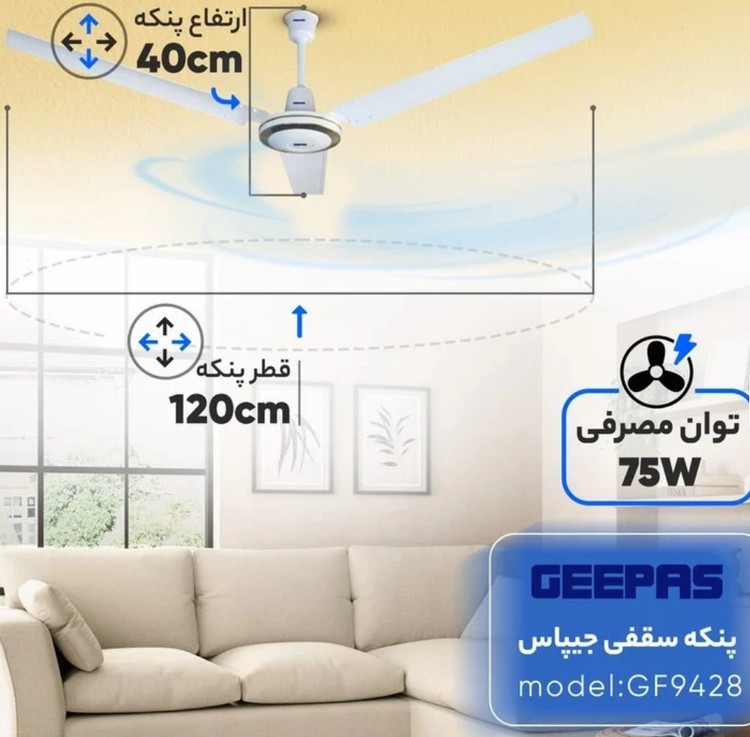 اطلاعات کامل محصول به شرح زیر : پنکه سقفی جیپاس مدل GF9428 پنکه سقفی جیپاس یکی از بهترین پنکه های سقفی دنیاست که مدل های مختلفی از جمله سقفی رومیزی و ایستاده دارد شرکت جیپاس سالهاست محصولاتش زبان زد خاص و عام است و مشتریان زیادی در سراسر جهان داد . 💯سیم پیچی موتور مس خالص 👌مقاوم دربرابر خط و خش و زنگ زدگی حداکثر سرعت 290دور در دقیقه 👌 🔺دارای کلید سه حالته🔺 🔺دارای توپی دوبل 🔺 توان :75وات واقعی بهترین کیفیت در عین حال بهترین قیمت 😍
