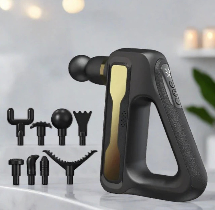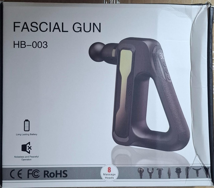 ماساژور برقی: ماساژور تفنگی ۸ سر Fascial Gun مدل HB-003 با موتور قوی، ماساژ ضربهای عمیقی ارائه میدهد که به عضلات نفوذ میکند.